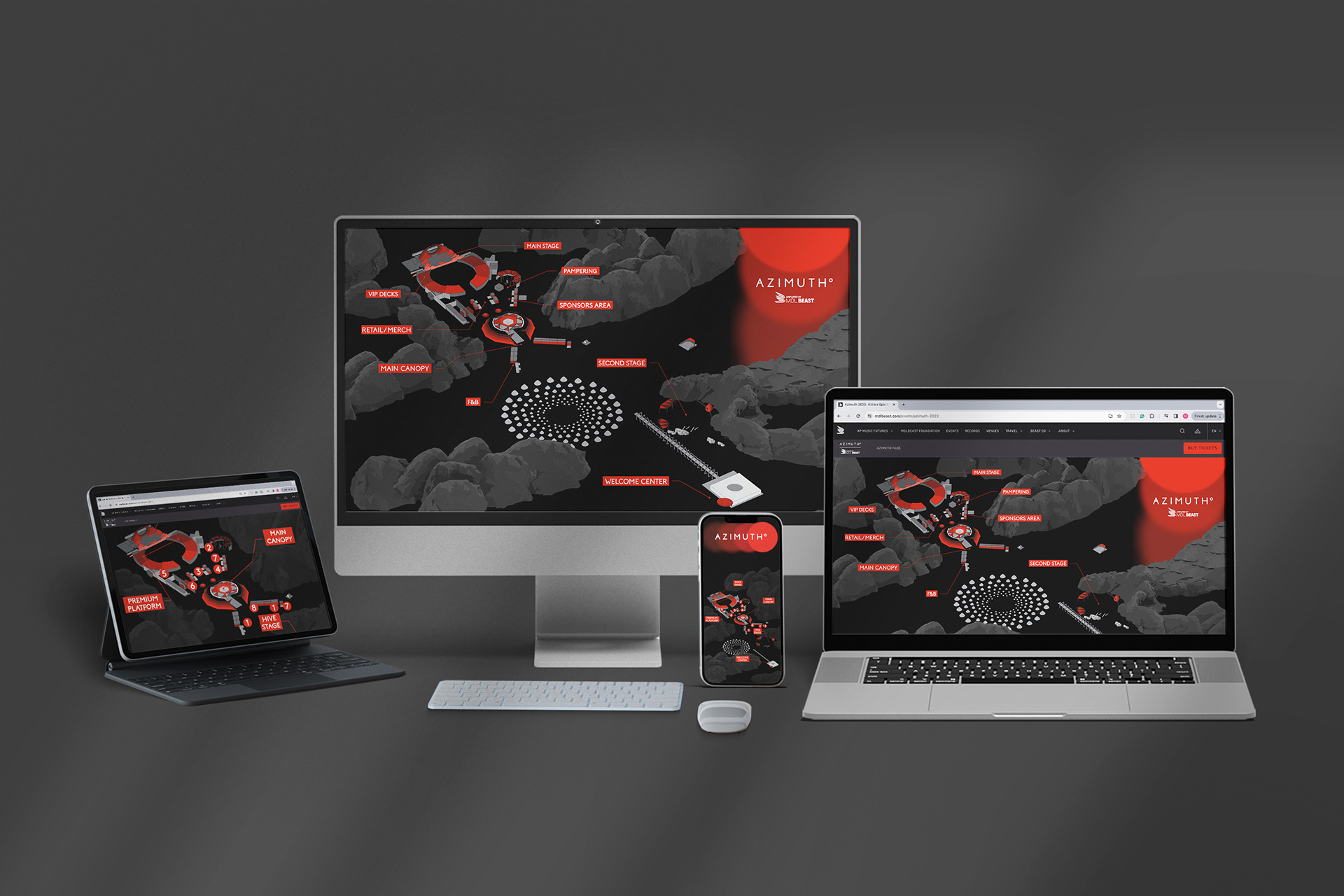 Wayfinding signage and illustrated site map created for Azimuth, a cultural music event in Saudi Arabia.